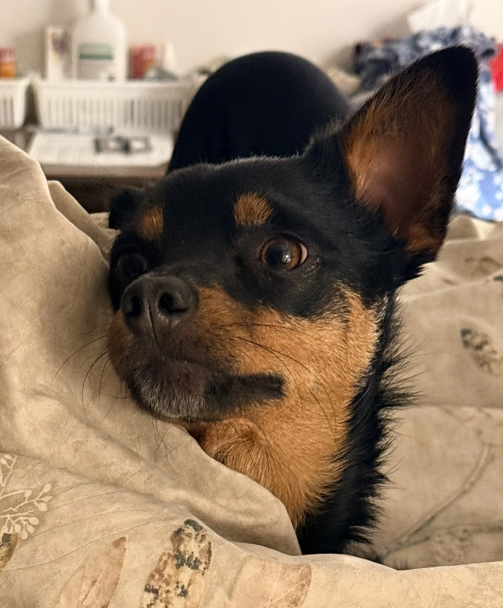 Riley, one year old—an Australian Cattle Dog with a constant sense of purpose. He shadows Alice everywhere, gently herding her thtough the day. Here, at 7:00 AM, he greets me from the top of our bed, alert and fully present. There’s a sweetness to these morning moments that never feels routine.
